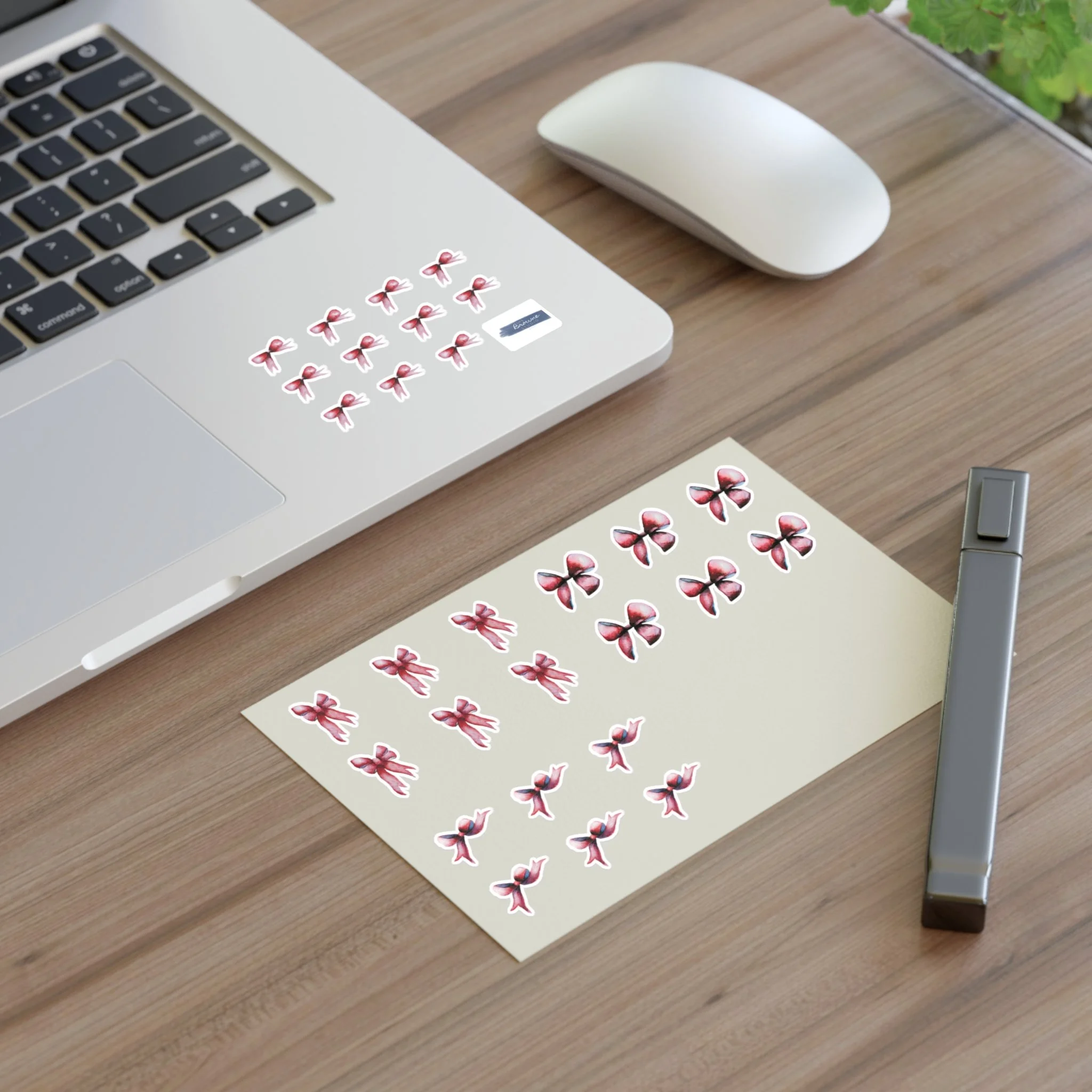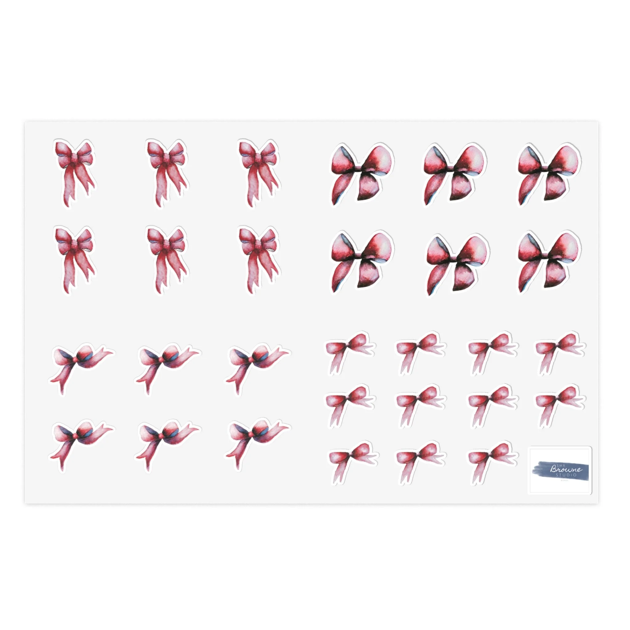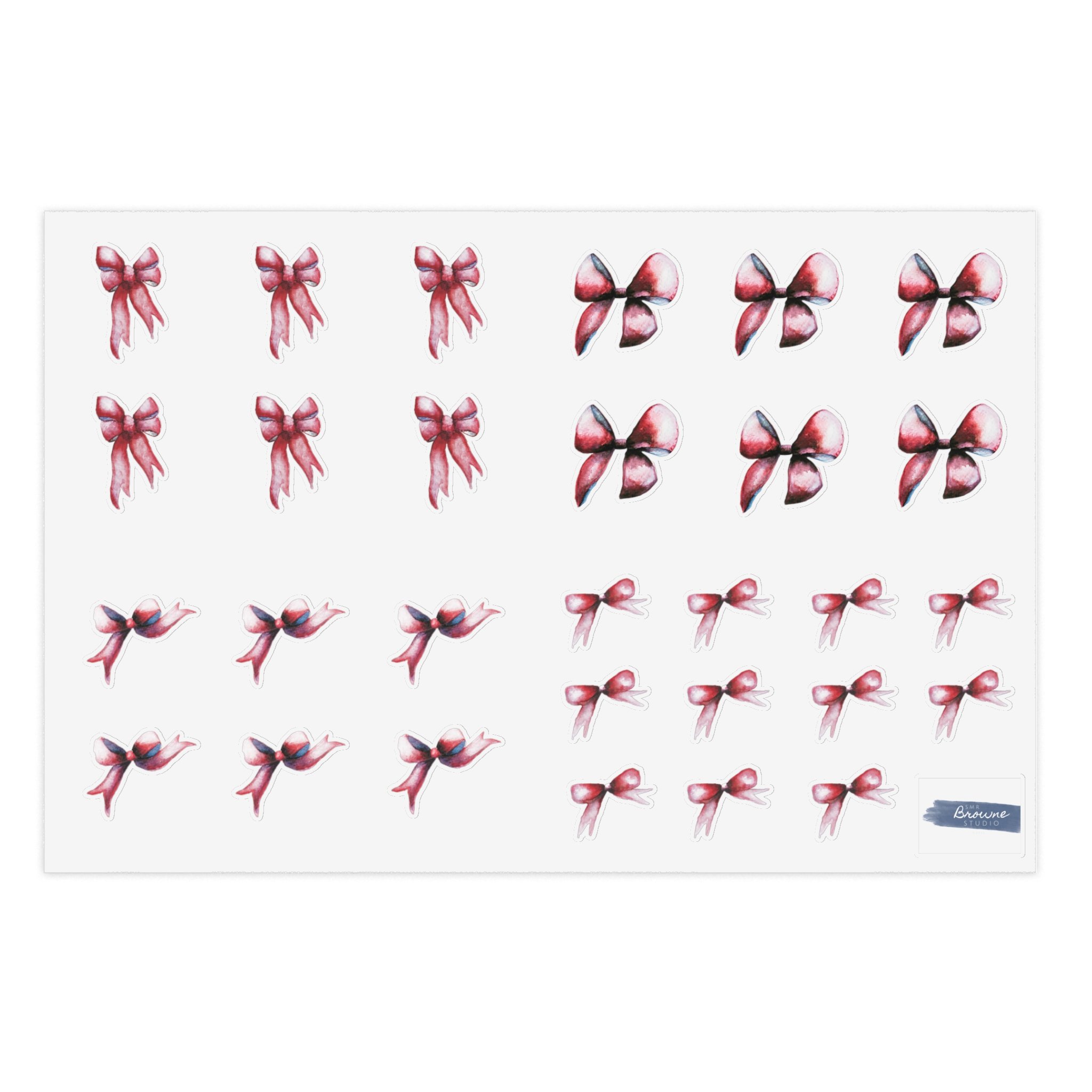 Our red holiday bow vinyl sticker sheet (4x6in) gives you the perfect finishing touch to any envelope, card, or journal. With a vinyl construction and full design/shape customizability, you can create unique sticker bomb sheets with multiple stickers for all your needs. All bows are based on paintings done by Shannon Browne and are available in white and transparent versions.